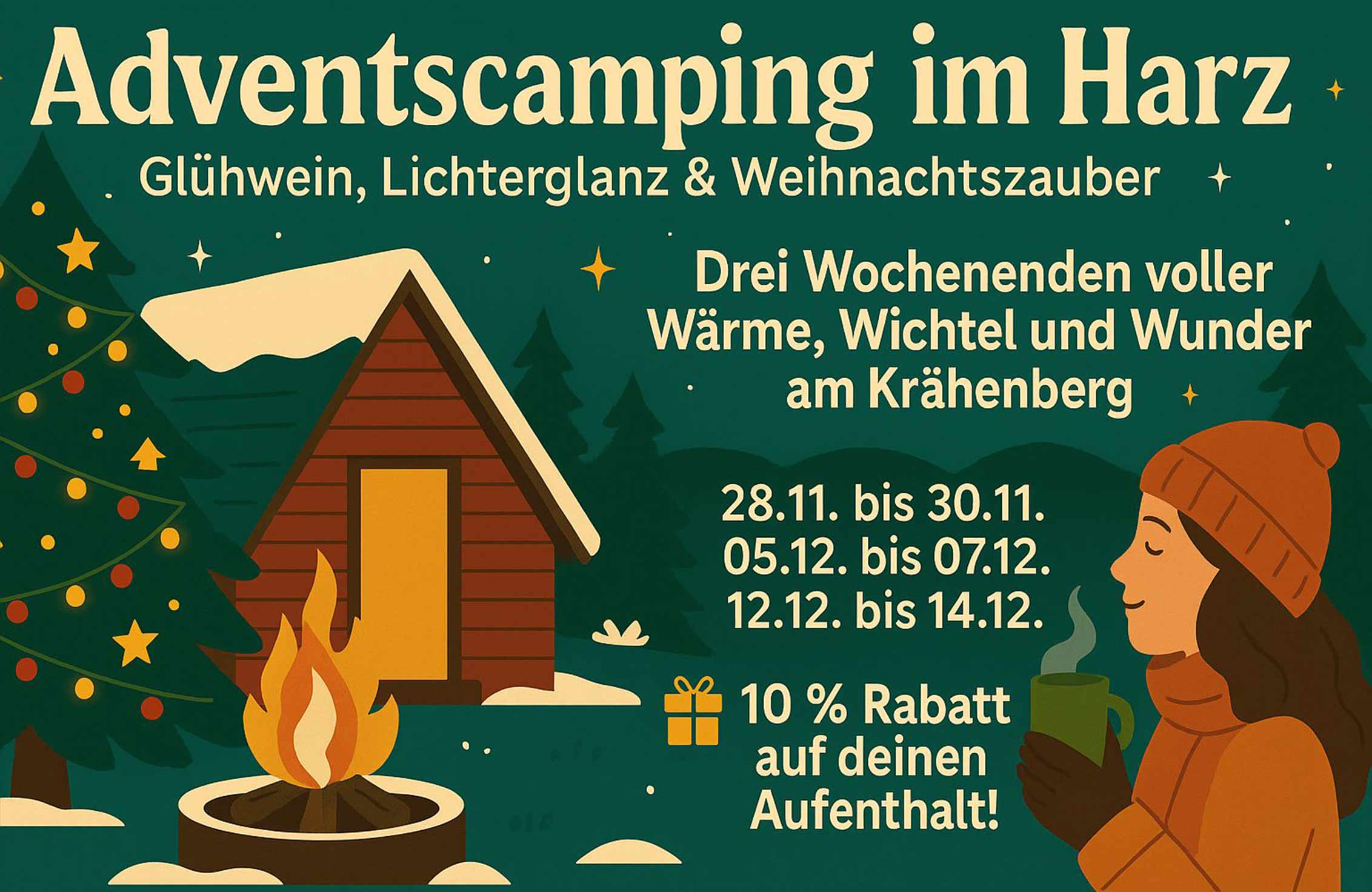 Na, bist du schon in Weihnachtsstimmung oder brauchst du noch ein bisschen Harzmagie? ✨ Dann pack die Thermoskanne ein, zieh die Mütze tiefer und komm zu uns auf den Campingplatz am Krähenberg – denn hier wird die Adventszeit richtig gemütlich! Vom 28.11. bis 30.11., 05.12. bis 07.12. und 12.12. bis 14.12. laden wir dich zu unserem Adventscamping ein – mit Glühwein, Lichterglanz, jeder Menge Harzer Herzlichkeit und einem kleinen X-Mas-Geschenk obendrauf: 10 % Rabatt auf deinen Aufenthalt! 🎁 So bleibt sogar noch etwas Geld übrig – für Lebkuchen, Punsch und vielleicht das ein oder andere Geschenk unter’m Baum.